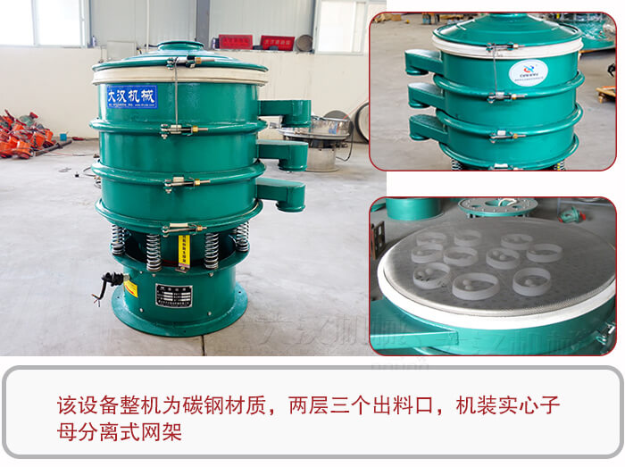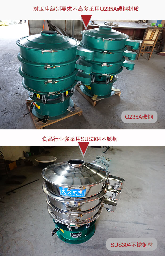 該設(shè)備整機(jī)為碳鋼材質(zhì),兩層三個(gè)出料口,機(jī)裝實(shí)心子母分離式網(wǎng)架,歸屬于常見的輕型振動(dòng)篩分設(shè)備,也就三次元振動(dòng)篩,碳鋼振動(dòng)篩,本公司生產(chǎn)的DH系列振動(dòng)篩可根據(jù)客戶不同需求1-5層同時(shí)使用,產(chǎn)品型號(hào)齊全,可滿足各種粉末、顆粒篩分需要求及液體過濾需求,也可設(shè)計(jì)為超聲波振動(dòng)篩粉機(jī)、氣流振動(dòng)篩粉機(jī)、振動(dòng)篩粉機(jī)等機(jī)型。食品行業(yè)多多采用SUS304不銹鋼,對衛(wèi)生級(jí)別要求不高多采用Q235A碳鋼作為主要材質(zhì)。