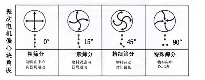 當(dāng)上下偏心塊調(diào)至0度時,物料由中間向四周分散,用來大量篩分粗略的物料。