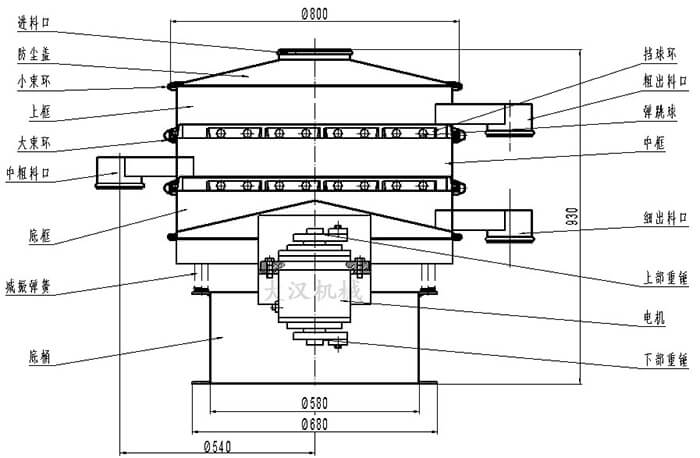 油漆除雜振動(dòng)篩利用YZUL立式振動(dòng)電機(jī)作為激振源,通過(guò)振動(dòng)電機(jī)上下兩端的偏心重錘將旋轉(zhuǎn)運(yùn)動(dòng)轉(zhuǎn)變?yōu)樗?、垂直、傾斜的三次元運(yùn)動(dòng),并傳遞到旋振篩的篩面上;物料通過(guò)入料口進(jìn)入設(shè)備內(nèi),根據(jù)不同物料篩分要求,物料經(jīng)過(guò)1-5層采用不同目數(shù)的金屬編織篩網(wǎng)的篩分層,在這個(gè)過(guò)程中,位于各層的篩網(wǎng)下的清網(wǎng)裝置(彈跳球)通過(guò)頻率振動(dòng)不斷撞擊篩網(wǎng),使篩網(wǎng)上層物料能夠順暢的透網(wǎng)篩分,并有效解決了物料堵網(wǎng)問(wèn)題出現(xiàn),不同目數(shù)的物料通過(guò)各層對(duì)應(yīng)目數(shù)的篩網(wǎng)后在各層的出料口排出,從而實(shí)現(xiàn)篩選除雜或過(guò)濾分級(jí)的目的。調(diào)節(jié)上、下兩端的相位角,可以改變物料在篩面上的運(yùn)動(dòng)軌跡。